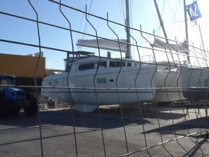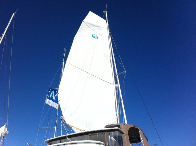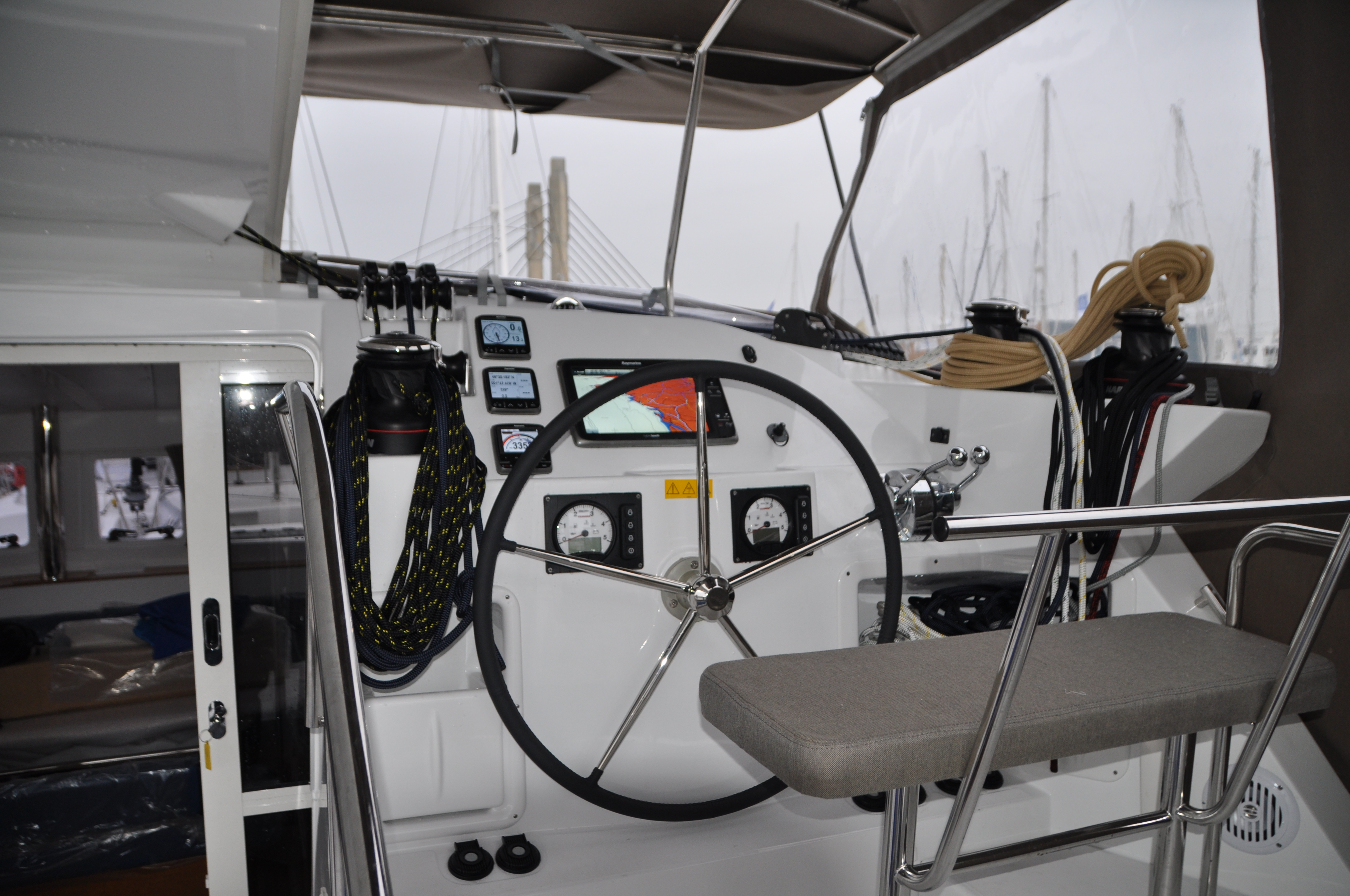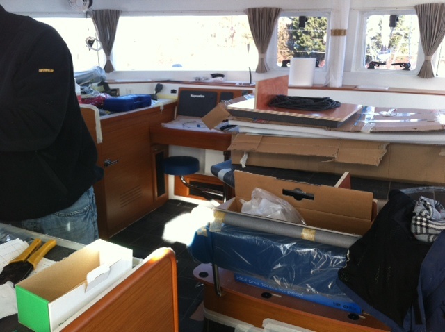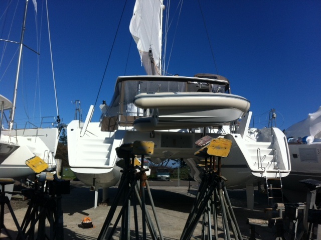 But it was great to see her in the flesh. We hopped on board and had a quick look round as there were workers crawling all over it. Then we went and had a drink or three on Ooroo 1 – Mike and Leanne’s new Lagoon 450. How weird is that – two couples from Perth getting new Lagoon’s parked up in France, one behind the other.