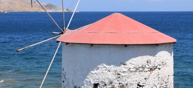 Next morning we shifted around to the east coast of Leros and anchored up in Pandeli, under the castle and the Greek windmills. Michael and Elaine wanted to organize their ferry tickets to Rhodes so we walked across to Lakki on the West side – not far.