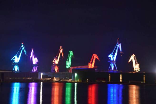 “Renowned lighting designer Dean Skira has lit up the shipyard’s iconic cranes in 16,000 different colour schemes, which come alive four times every evening on the hour, starting at 9pm for 15 minutes.”