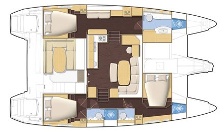 - Cockpit useable as outdoor salon, accessible via a stern walkway connecting both transoms