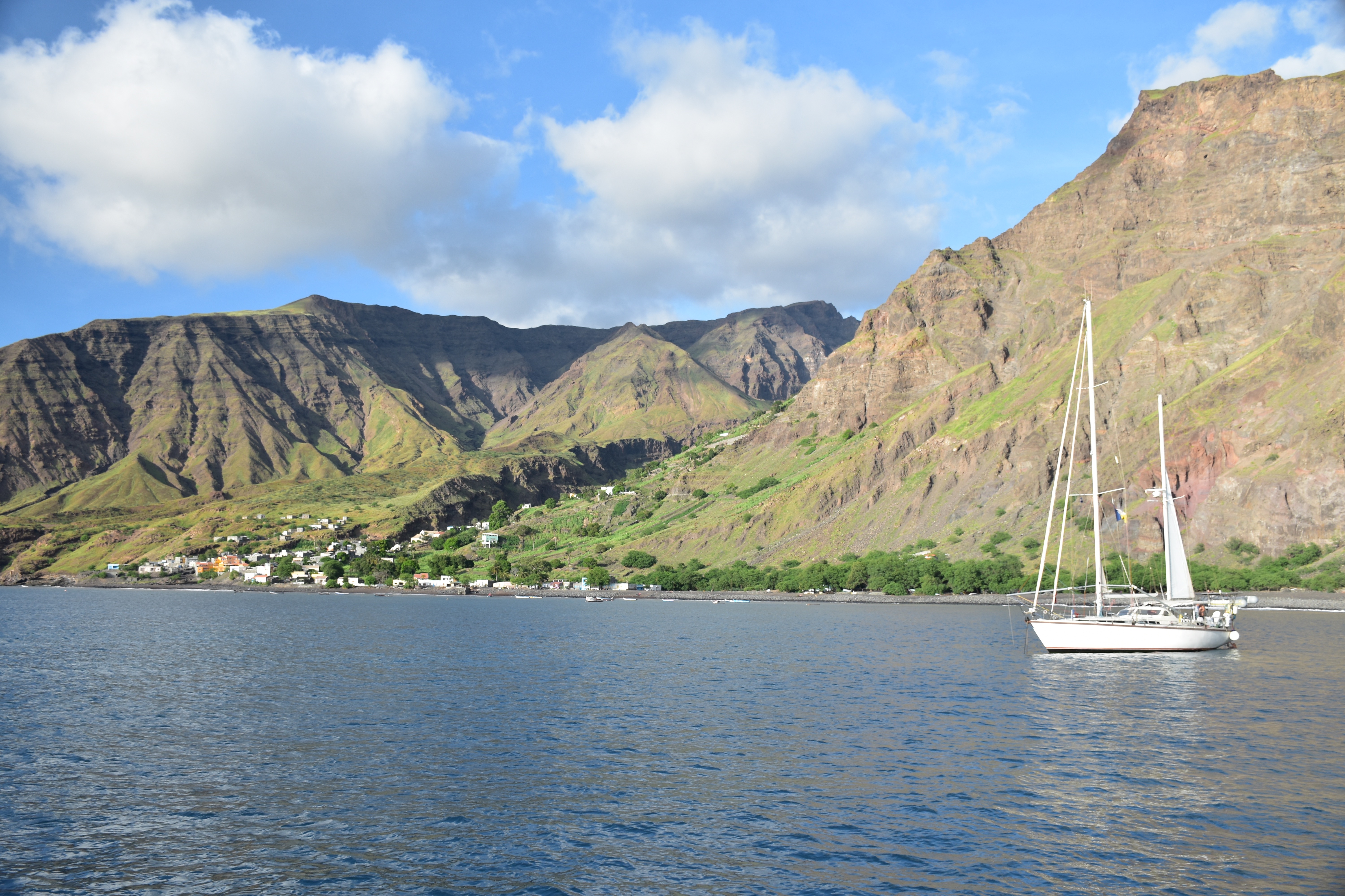 Our first stop was Tarafal on the island of St Antao, 23 nm away. We left the marina at about 11am and had a great reach doing 7kts until we got to the lee of Santo Antao, where the wind dropped to nothing. We motored around to the SW corner where we dropped anchor in 15m of water. The anchorage was small but spectacular with huge cliffs dropping down to a large black sand beach. Tarafal is a short dingy ride away, albeit with an interesting surf landing which took us a while to perfect.