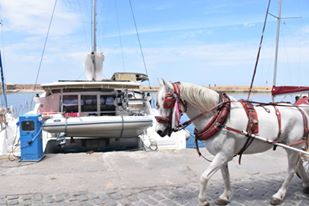 Next day it was off to Iraklion, Crete’s capital. Again, the wind was on our nose (but light) – the prevailing winds are from West to East and we were travelling West against them – them’s the breaks. We got to Iraklion at lunchtime and passed a cruise ship on the way out of the harbour. We continued to the end near the Venetian fort, where the rather full marina was and tried to raise someone, anyone to point us in the right direction. In the end we gave up and found a spot outside the marina in front of the Port Police. Very convenient, except for the ferry wash, which one high-speed ferry in particular caused havoc with our fenders and hull as we got black everywhere from the large tires that we parked up against. We put on a couple of our spring lines and that seemed to help a little.