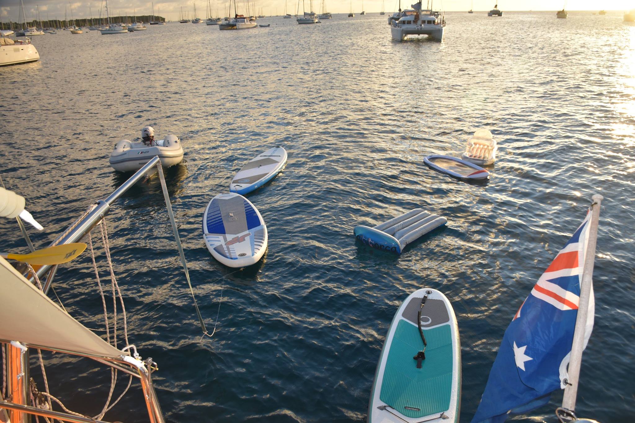 Stumps were drawn at about 10:30 pm (although nobody can recall the actual time), which prompted Rob to go for a bit of a swim. Now the thing to know about Rob is he NEVER goes swimming after 3pm – something to do with sharks evidently, but there’s something particular about Australia Day that inspired him (he claims that it was not enough mixer for his rum). His swim started with a classic Back strokers start – you know where they hang above the pool off the blocks – in Rob’s case he was hanging off the side of La Mischief trying to get in his dingy that wasn’t there. Slowly this fact dawned on him, as did his limited options, so drop he did into the sea. Cathy was in their dinghy and we managed to get Rob to swim around to the back of La Mischief to the swim ladder. Brilliant. Except that Rob didn’t like that hull and decided to check out the other hull. Finding no ladder there, he decided to swim back to his boat. Well maybe he did, maybe he didn’t because it wasn’t in the direction he was swimming. The search party convened and set off in pursuit. Rob had the dinghy keys in his pocket, so Cathy rowed after him. Gilbert and I got our dinghies going in hot pursuit and Simon tried his hand at stand up comedy, alternatively paddling and falling off, in mildly hot pursuit. Gilbert managed to find Rob in the dark and steer him towards his boat and its ladder. I towed Cathy back and left her to sort out her aspiring Mark Spitz. It’s not a great Aussie Day Party unless there’s a good story to be told the following day – thanks Rob.