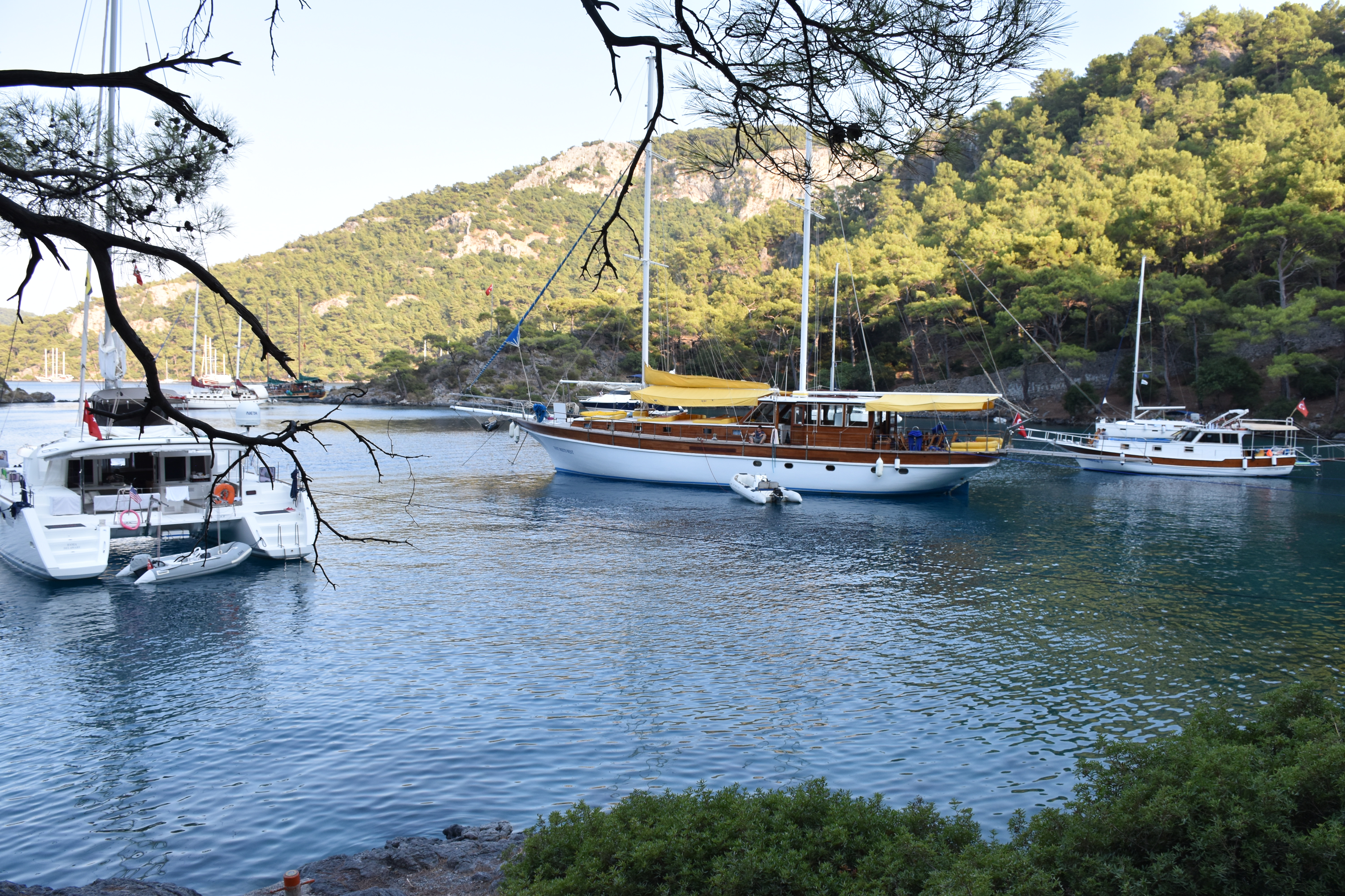 We pulled up on one of several restaurant piers at the front of the village, right next to a Lycian tomb sitting in a metre of water. You get the berth for free on the basis that you eat in the restaurant. Fair deal.