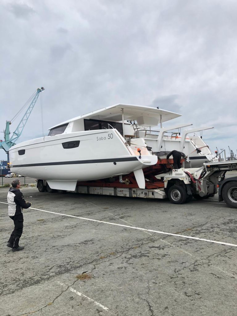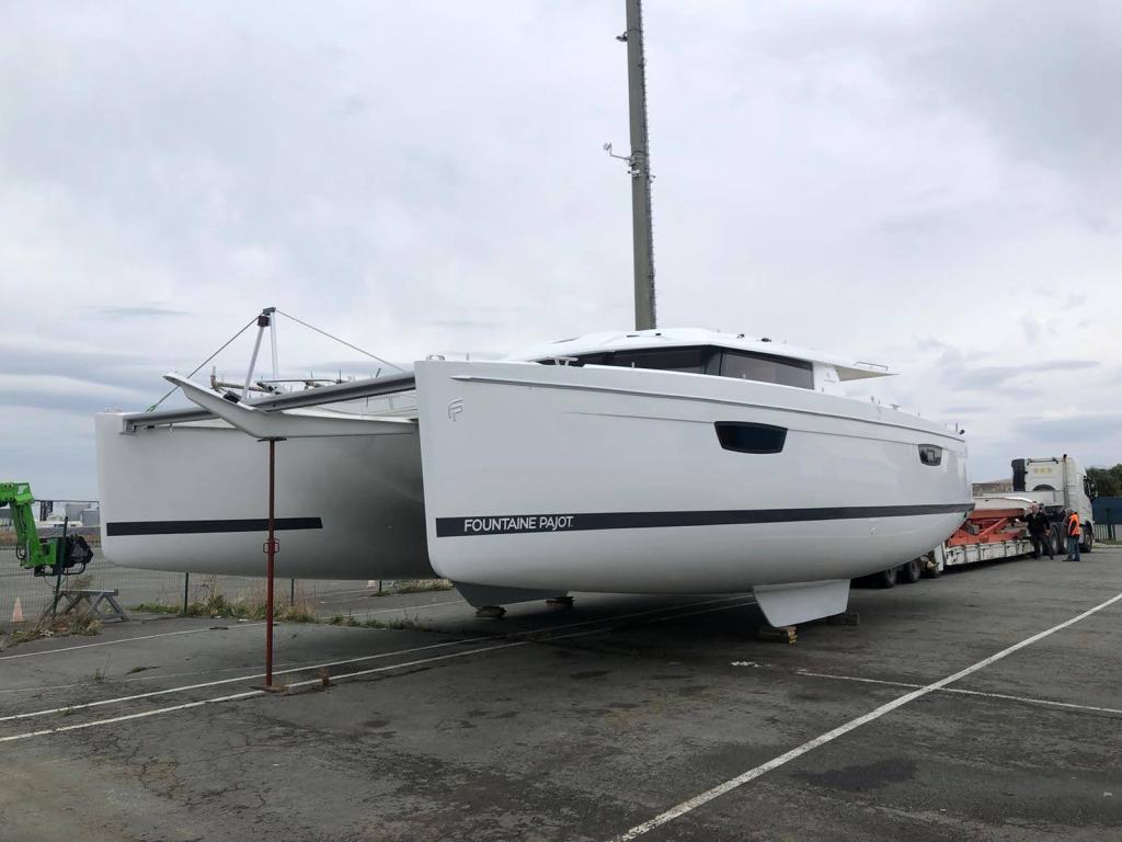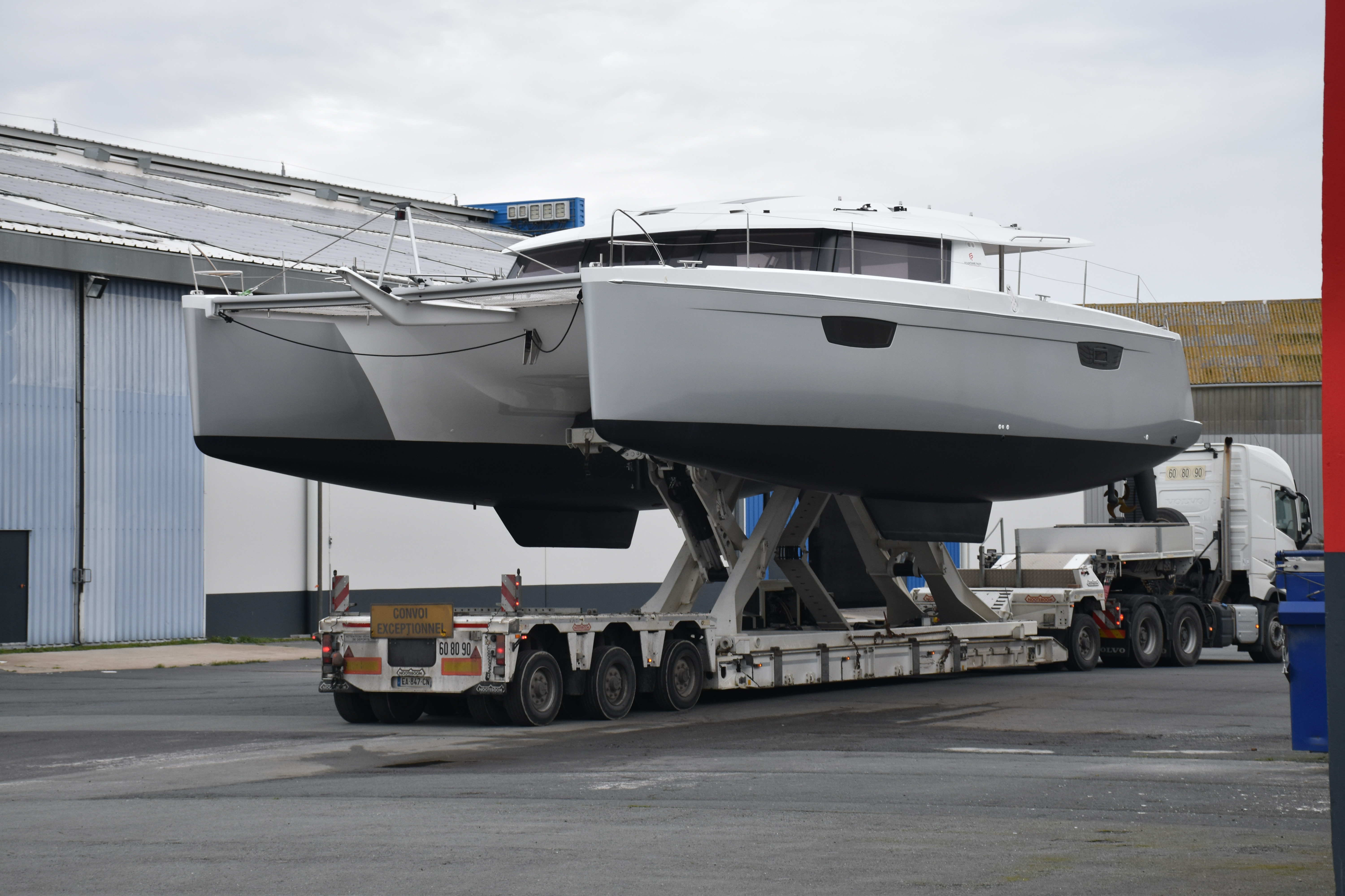 Well she is out of the factory and safely on the hard in La Pallice, where she will stay until we get there in a few months. Disappointed not to be able to drive behind her as she was trucked. Roms from Multihulls Solutions got us some video footage but its worth watching Out Chasing Stars video of their boat being trucked from the factory at https://youtu.be/REohRp_5X6k.