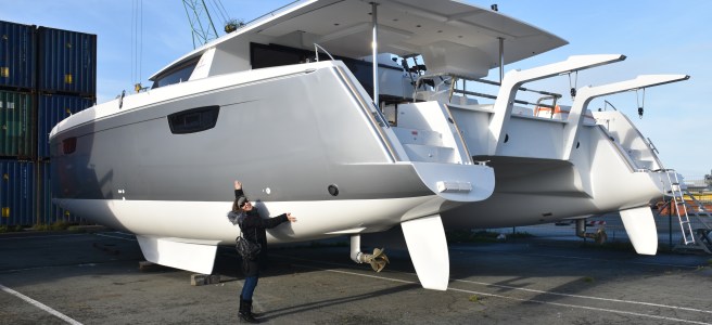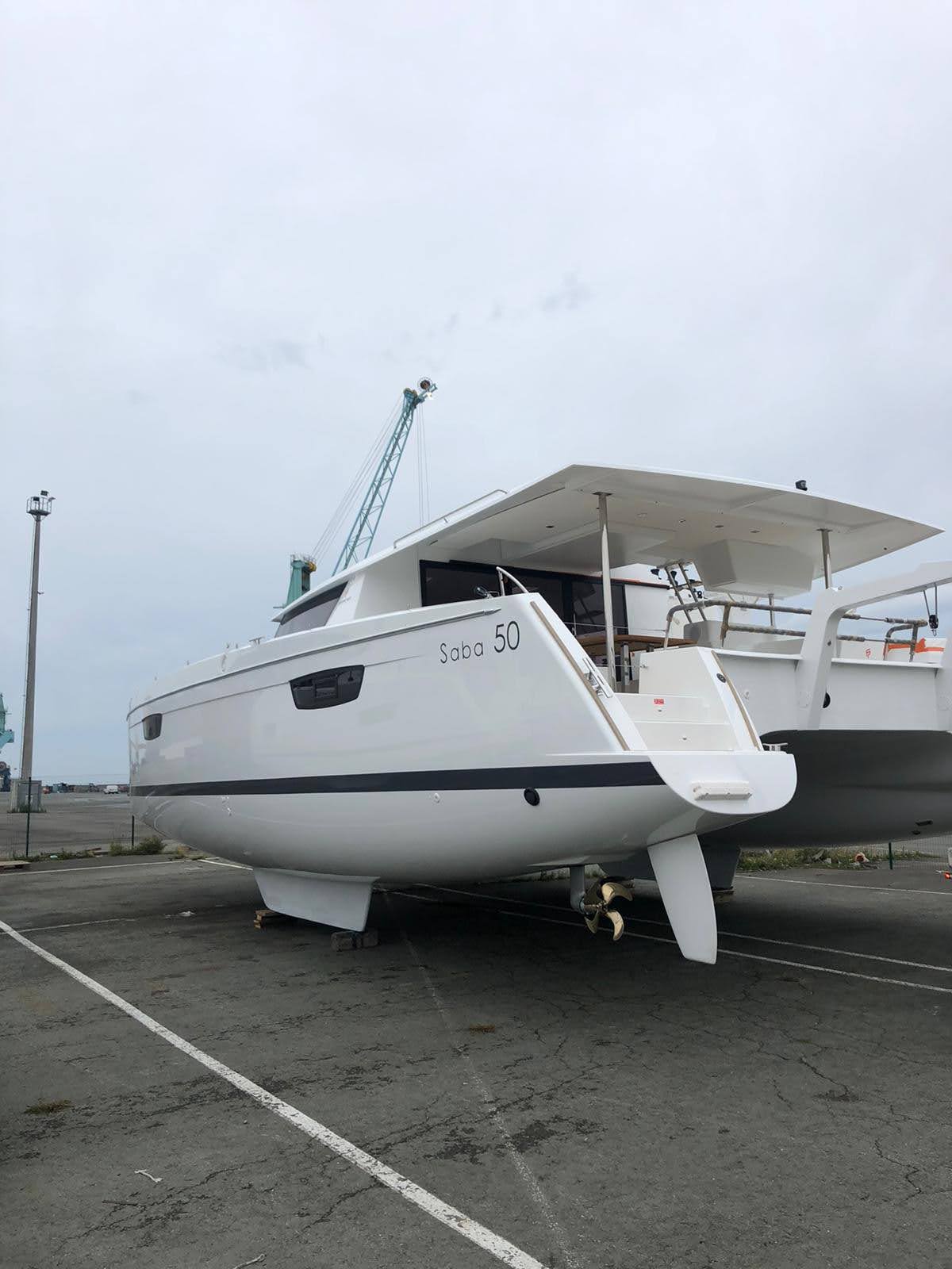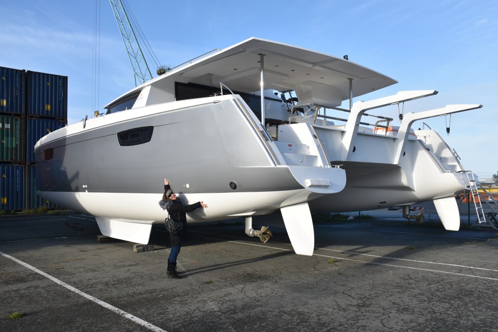 Yesterday, we managed to sneak into the Port and see our new boat. Very exciting! She will be down there until next week, getting all the necessary holes drilled into her hulls for underwater lights, forward facing sonar, watermaker, salt water deck wash and lightning protection. The antifoul will need to be applied on a clear day – a bit of a challenge with the rainy weather here. Then onto a truck again over to the travel hoist and into the water – next week hopefully.