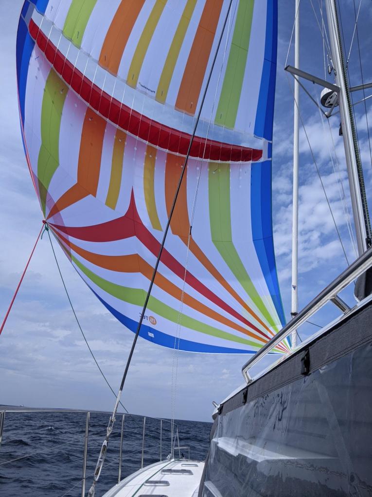 For colour, we’ve gone for both an Incidence Blue geneker and a Multi-coloured parasailor once again. Parasailor gave Dee carte blanche to get out her set of crayons and design the Parasailor (for free as its our second). The parasailer is 170m2 (the other option was 190m2). We chose the smaller option because it will get most of its use in the trade winds crossing oceans day and night and the smaller one is more manageable with the higher winds, especially when we plan to leave it up during squalls (as we did during our last Atlantic crossing). Uchimata installed a nice setup for the parasailor so we can easily run both the guy and sheet for each side back to two jammers on a single winch.