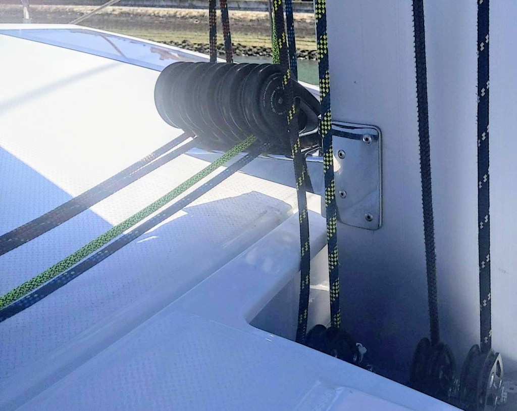The next challenge was Brexit. Products from the likes of Spinlock were impossible to order. Luckily Antal came from Italy and the Chanderlies could get hold of these part fairly quickly. However there were still a couple of rollers that we had to go up a size and a 5 way set of rollers became a 2 and a 3. We got Romu to make a Bale for the bottom of the mast to attach five vertical blocks to, and then we needed to get him to readjust the angle of the blocks when he didn’t get it right. As well as the new blocks, clutches, rollers, and frictionless blocks, we bought new dyneema cored lines for the reefing lines so we could go down from 14mm to 12mm and make them run well. All in all it took Loic a whole week to finish off this project and so far its worked well on our way down to Portugal. A very necessary and satisfying project.