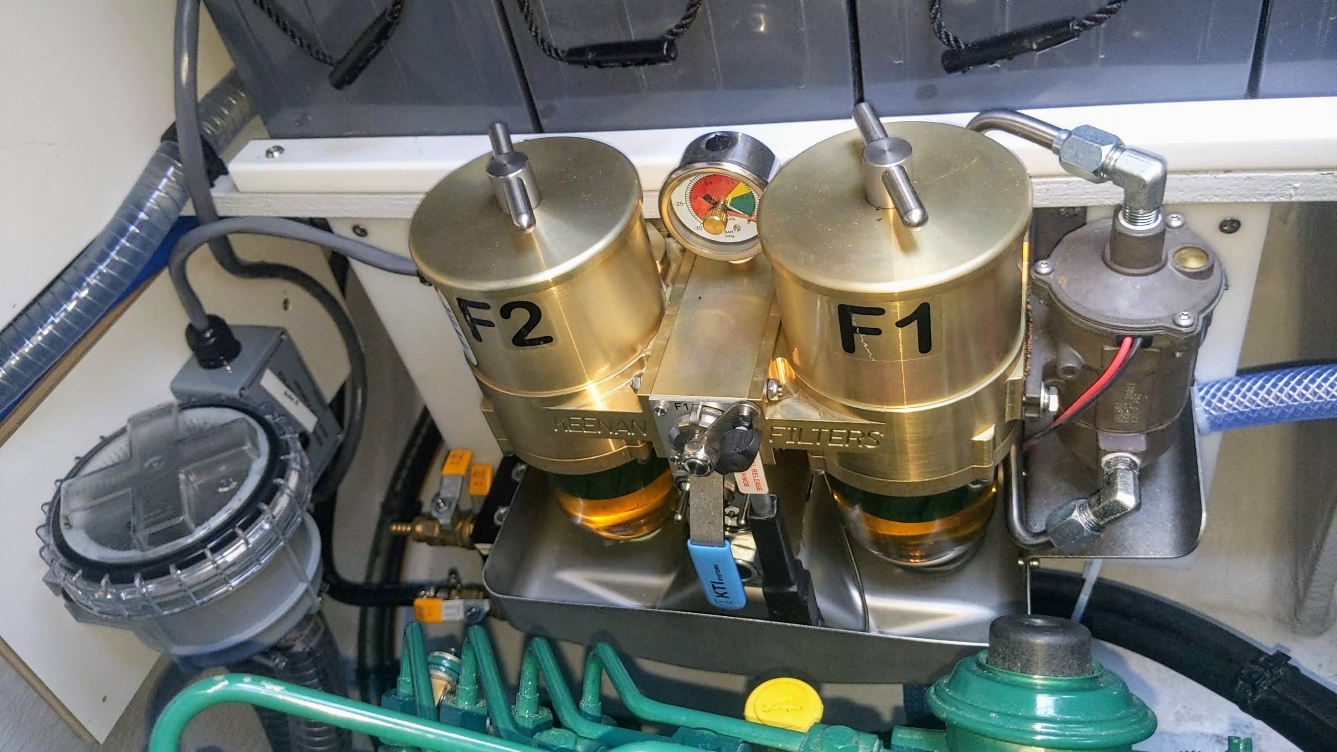 We’ve had a few friends who have previously experienced engine issues from bad diesel over the years and we were determined not to join them in this misery. So we ordered a Keenan Fuel System whilst we were in the USA and had it shipped from Fort Lauderdale with all our other gear from La Mischief, using East Coast Shipping, which worked well. Whilst in La Rochelle, we sent Alsino into the Engine Bays to install this very impressive looking system for baby bottom clean diesel. With this system, we can easily swap over to new fuel filter if one becomes clogged, we can polish the diesel in our tanks and we can also pump diesel from one tank to the other to balance things up.