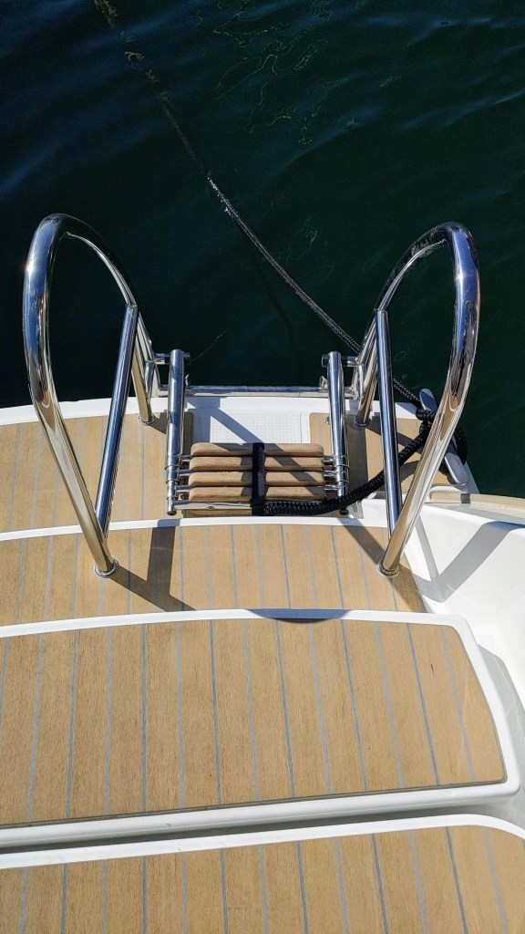 Romu, the Stainless Steel guy did really well out of us. We decided to go with 32cm high SS handrails down the sides of the boat and they are a great safety addition. The three teak steps to get up to the mast work really well. Finally, we quite liked our swim ladder on La Mischief as opposed to the FP one; which we ripped off and replaced with a you beaut custom designed swim ladder, with nice high handles, especially good for getting out of the water with a heavy dive tank on. Now looking forward for some nice weather and warmer water to swim in so we can actually use it.