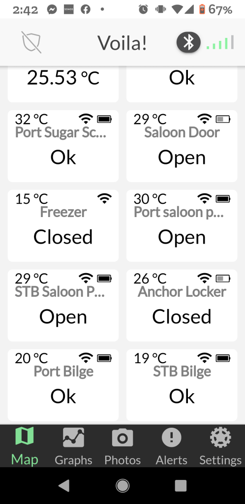 We’ve just finished installing the BRNKL system from Canada. It gives us peace of mind whilst ashore, telling us if Voila has moved out of its geofence whilst at anchor, if any motion sensors or door sensors have gone off, if any water has got into the bilge and if anyone has run into us. The on board 120 decibel alarm should scare off anyone on board. On top of this we have motion detector lights on the sugar scoops and a video camera that sets off with any movement. For A Little Bit of Mischief (our Dinghy), we have a Yacht-Sentinel monitoring system that does pretty much the same. But unfortunately its not working and we have had to return it to them in England to see why.